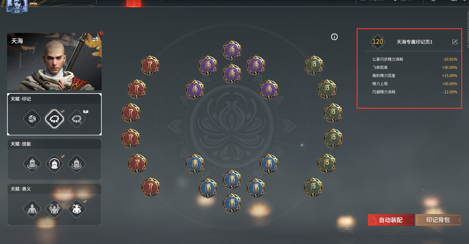 所以总结就是所有精力印记全部点满,红色加速怒气点满,紫色(爆怒),蓝色钩锁距离点满。