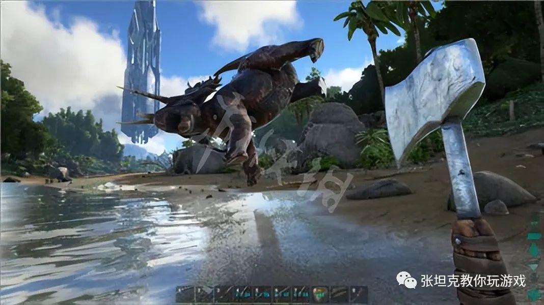 另外咱们之所以选择树多石头多的水边也是有道理的,水边龙多,很多龙会卡在树和石头的bug里不能移动,犹如待宰羔羊,上去用矛最远距离戳它们,注意周围不能有同类,否则它的同类会来干你,建议甲龙一定要杀,经验非常丰厚。矛坏了就继续造,时刻保持3根以上