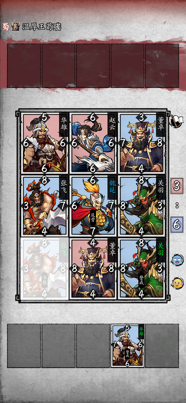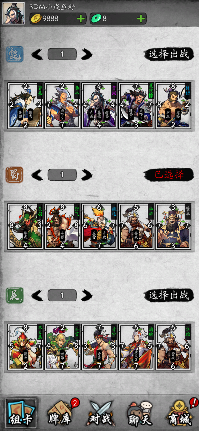 不同国家武将的特性也不同,蜀国的武将尽管勇猛但有长有短的武将,比如张飞的四维点数是8833。魏国武将则是四维点数属性中上,但技能多以提升数值为主,叠加buff。 吴国更多的是以巧破力为主,比如陆逊比四维点数,小者胜。