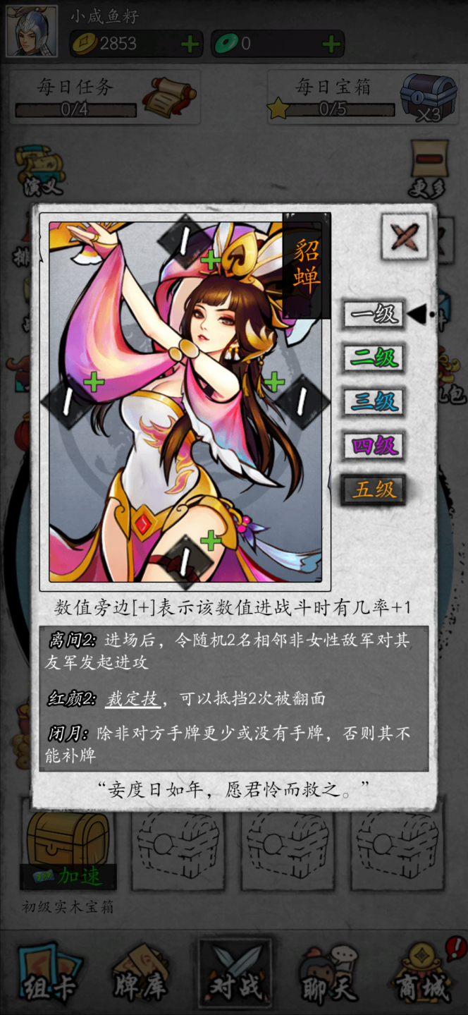 武将卡牌是有等级的,以白、绿、蓝、紫、橙分为五级,每提升一级,武将的能力就会提升,其中到第二级绿阶解锁第一个技能最为明显。但提升等级不会提升自身的四维点数。在竞技平衡上,不同英雄卡牌的四维强度与技能都是被严格把控,太多看似强力的武将或技能都有自己的弱点、副作用以及被克制的手段。