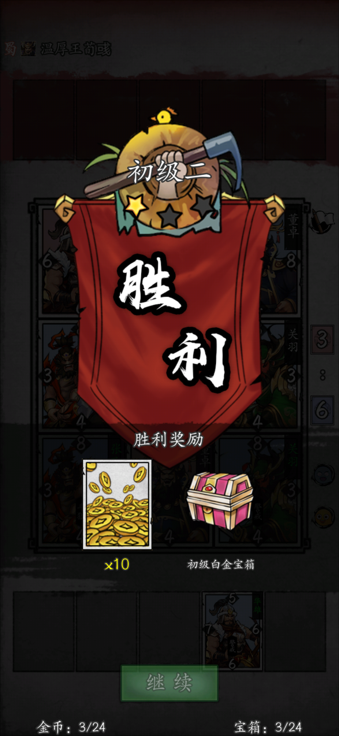 数值的积累与金币、箱子收益有关,每次获胜都会获得一定量的金币与一个随机等级的箱子。箱子中有金币与卡牌若干,同级别箱子的情况下,越高段位的玩家开箱获得收益更高。因为提升武将等级需要资源,所以对等资源情况下,玩家的武将等级水平也是对等的,所以只要做满每日3个箱子的日常,玩家的卡牌级别大多能保持在同一水平线。