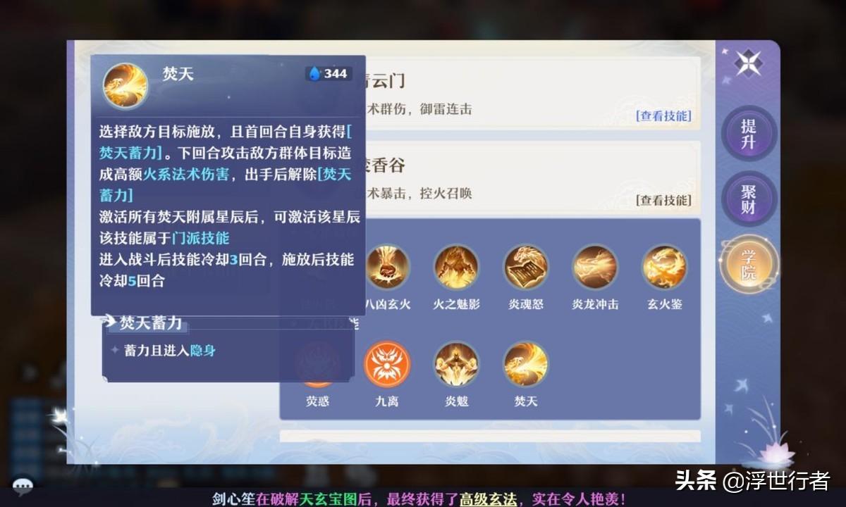 八凶玄火:被动增加人物法力,最多可以秒5个,焚香使用频率最高的群攻型技能,可以为主目标施加3回合的灼烧状态,稳定输出,伤害很爆炸。