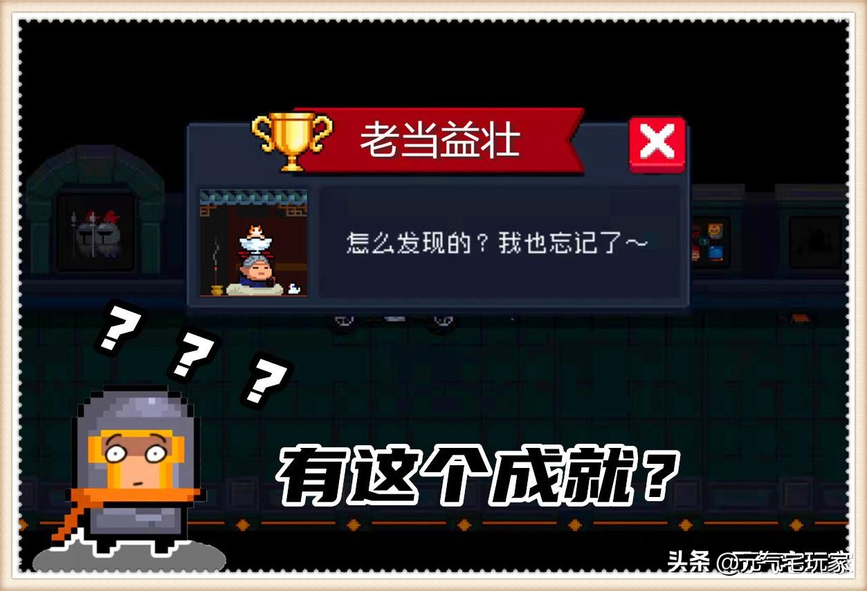 如果说以上几种成就的解锁难度还在掌控之内的话,那么上图中的“老当益壮”成就任务,就有些考验玩家的“智商”了。因为不知从什么时候开始,在《元气骑士》的各大论坛中就传出了,用千岁奶奶通关DZT就能激活此成就的说法。但是当大家贸然去地牢尝试之前,为何不先去地窖中看一下,是否有这个成就的专属相框呢?