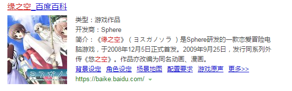 恋爱冒险类游戏,曾被改编成为漫画,可谓火爆2008年。多玩游戏有评价道,《缘之空》以其清新的原画及冲击性的兄妹题材而吸引了广大玩家,成为日本的大人气萌系游戏之一。该游戏是一部旨在令人痛哭疾首(感人)又处于争议之中的作品,其兄妹主线更是成为一大争论焦点。
