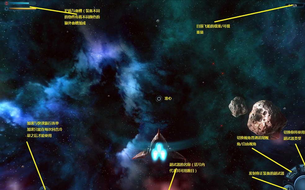 主武器系统和副武器系统,而玩家可以通过鼠标左键进行主武器系统的发射,鼠标右键进行副武器系统的攻击 左上则是飞船的护盾和血量状况。左下的图标则是开启加速前进或者打开快速旅行菜单