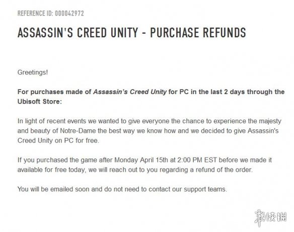 在东部标准时间4月15日下午2:00(北京时间4月16日凌晨3:00)后至此次免费活动之前购买《刺客信条:大革命》的玩家,育碧将会发送邮件与您取得联系进行退款,无需玩家联系育碧的售后支持团队。