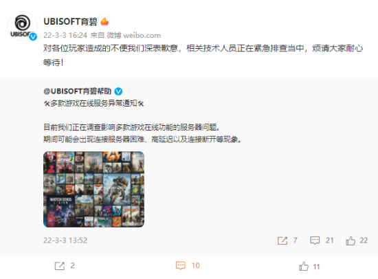 育碧官方刚刚发布微博呼吁玩家们耐心等待,相关技术人员正在紧急排查中。