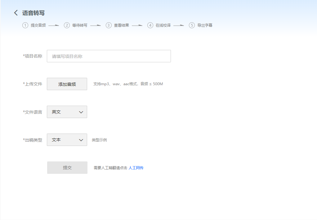 今天我们要讲的语音转文字就是它的语音转写功能。它的操作非常简单,首先上传文件,其次选择文件语言(中文/英文),再选择出稿类型(文本/字幕),最后点击提交转写即可。