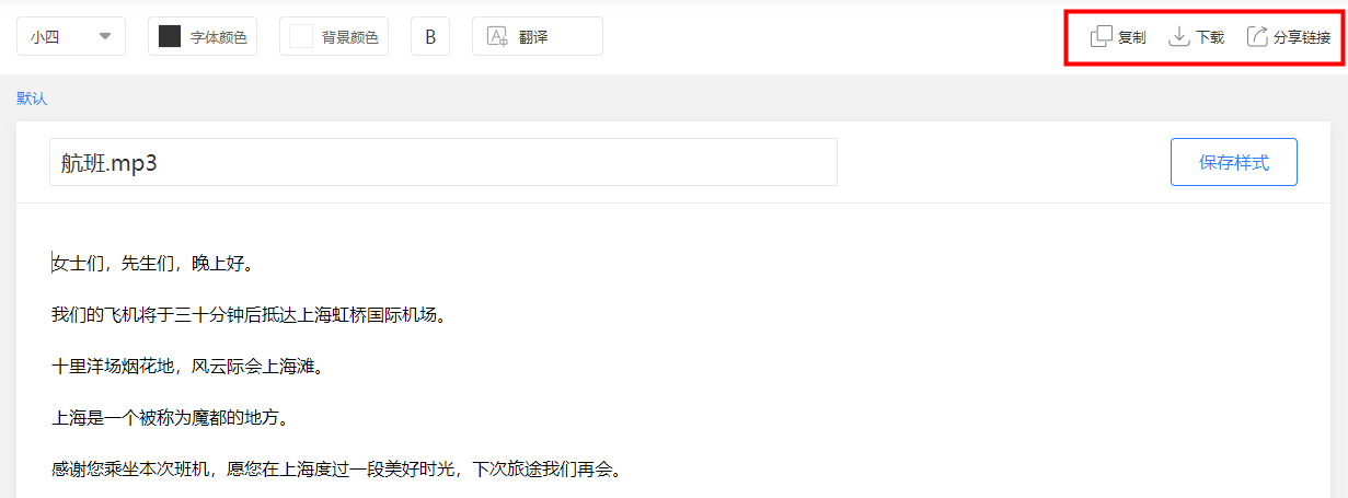 对于文字的下载和使用,知意字稿支持复制、下载文档、生成分享链接三种方式,大家可以根据需求选择。