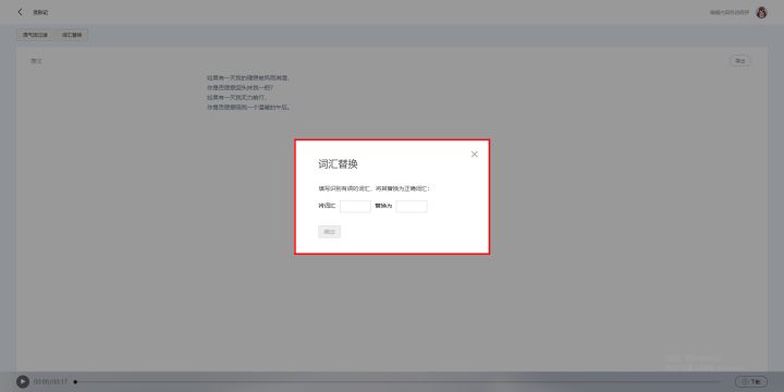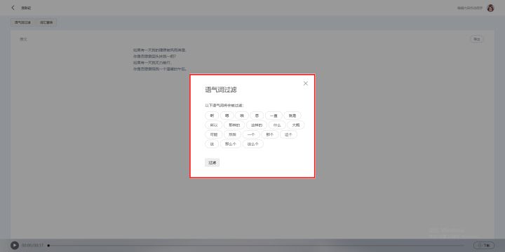 转写完成的稿件可以编辑修改和直接导出,也可以对文字内容进行语气词过滤和词汇替换。