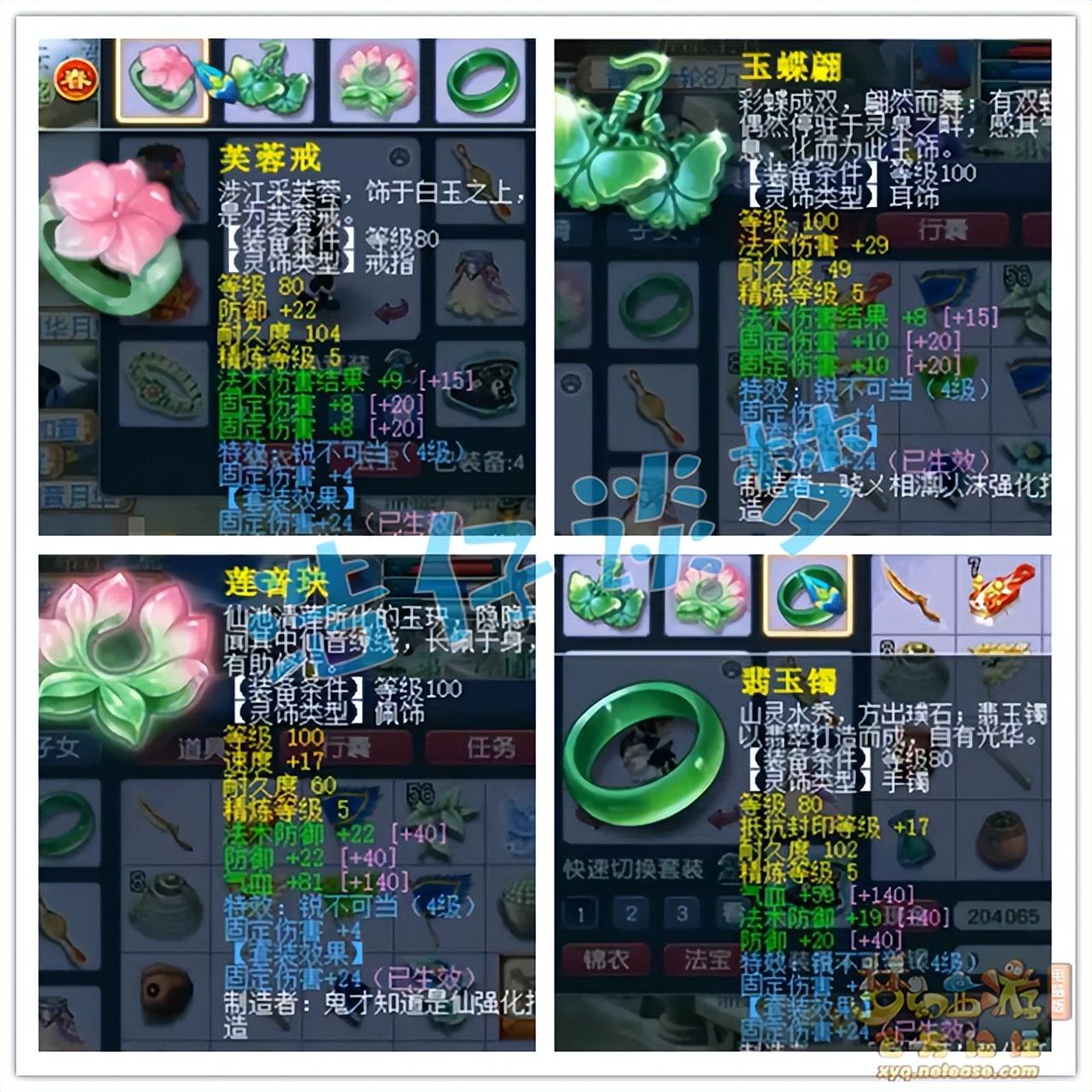 戒指和耳饰下排都是双固伤一法伤结果,不过法伤结果对于固伤来说无效,平民玩家双固伤是最好的搭配。佩饰和手镯下排都是气血防御法防,这也是最具性价比的搭配。特效4级锐不可当。