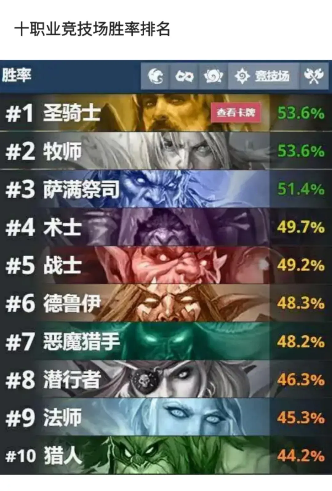 竞技场续航很重要,术士技能永远是T0;竞技场节奏也很重要,贼的转刀能赚到不少节奏,强;本来瞎子的技能是最强的,但由于卡池较弱,实战优势就没那么大了,和法师萨满处于同一梯队。