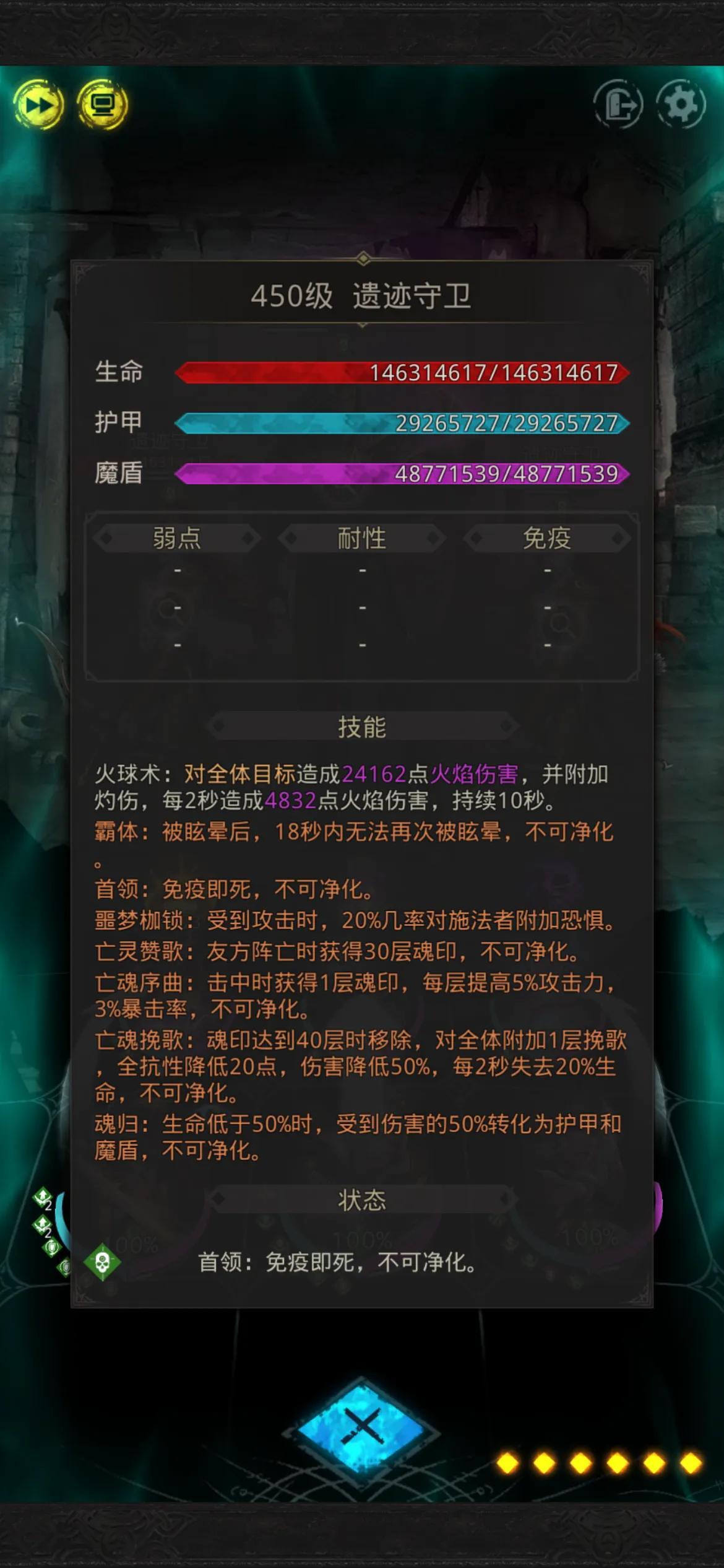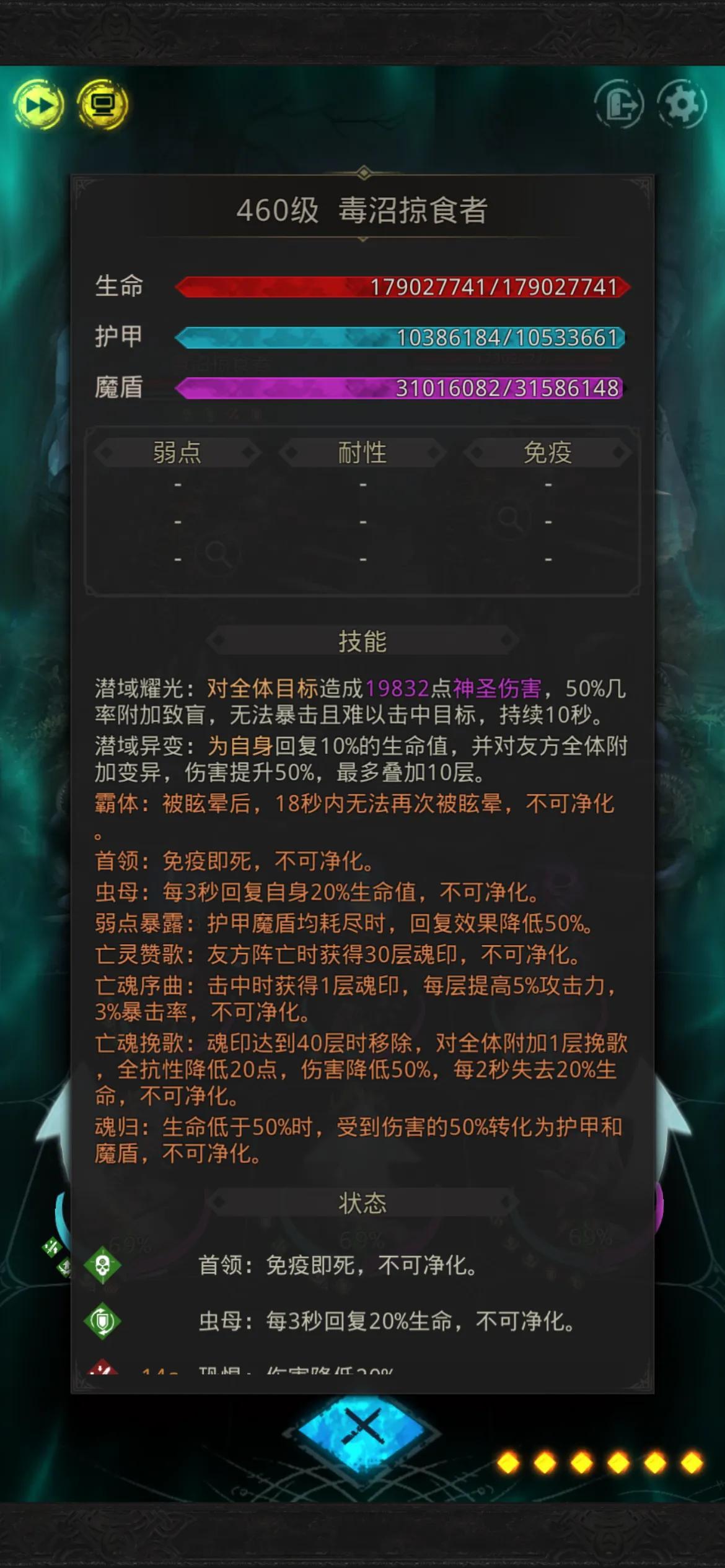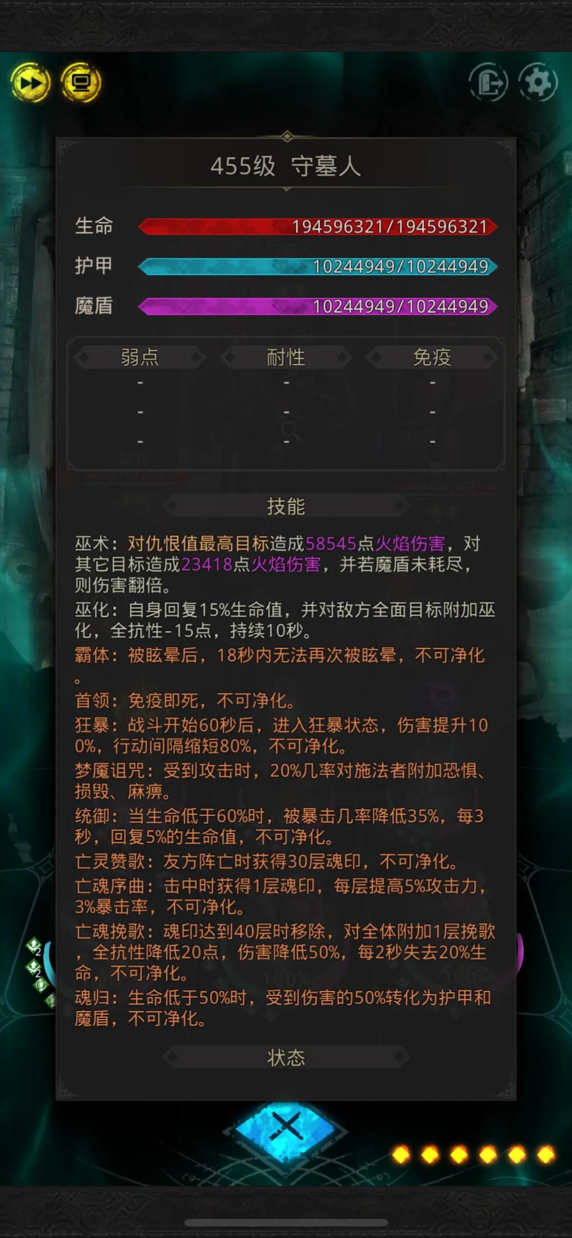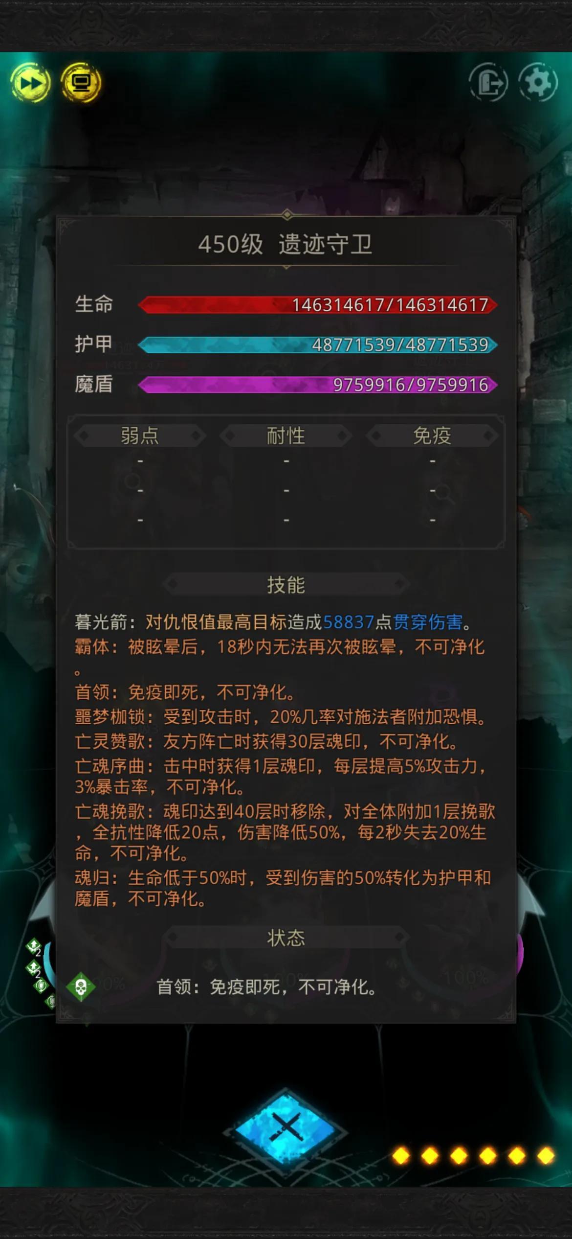 第一张图,比较难打的点在秒掉一个怪的情况下,boss的伤害会有个巨大提升,直接加30层魂印,好的点在于怪物血量不算很高,秒掉2个弓箭手,剩下的奶妈可以把血回上了,但赌暴击的概率很大,无狂暴,拖太久还是可能会突然暴毙