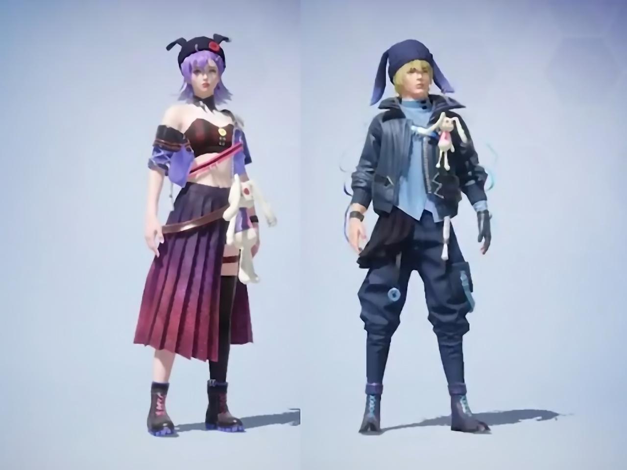 第3款套装名为“暗夜傀儡”,这款套装的女款还是挺特别的,下面的长裙颜色也有种星空的深邃感觉。男款的话,小鱼干就有点欣赏不来了,衣服上那个兔子玩偶倒还不错。