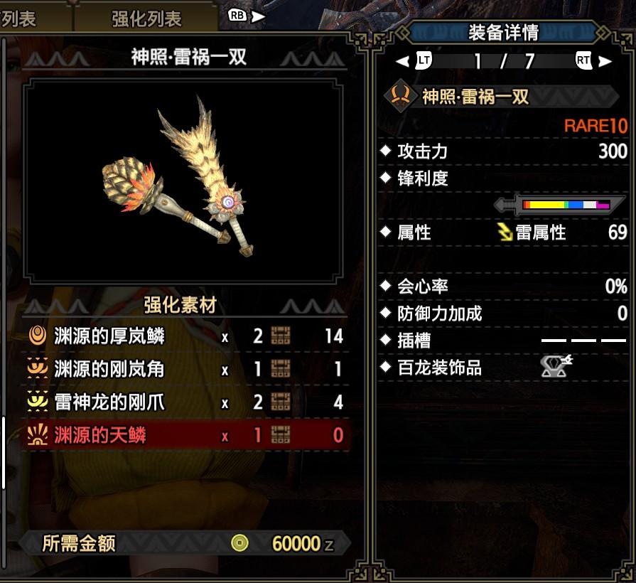 武器选用的是雷神龙双刀,由于曙光后双刀的属补收益明显增加,基本可以确定常规弱属性在15以上基本都可以超过物理收益配装了。