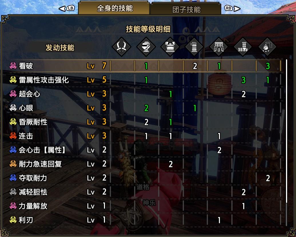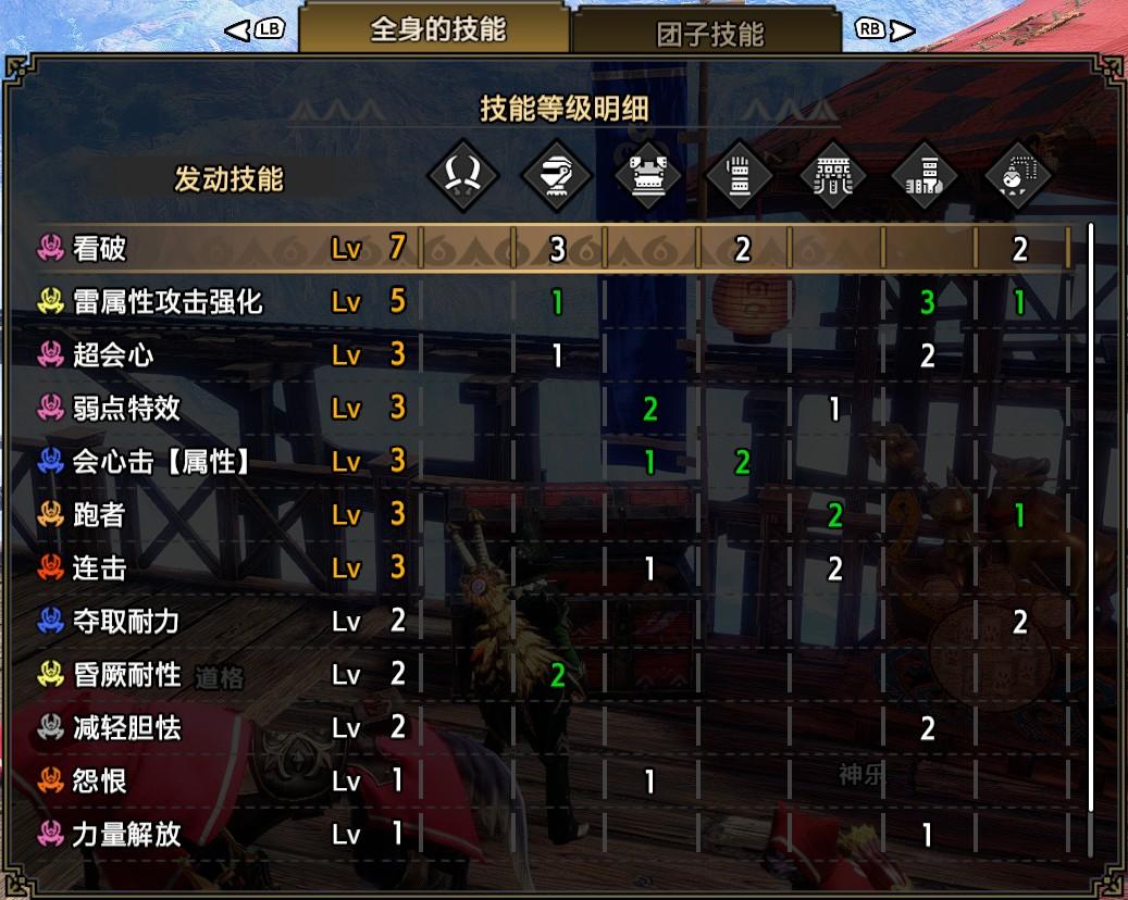 技能:看破7,雷属性5,超会心3,弱点特效3,会心击【属性】3,跑者3,连击3,夺取耐力2,昏厥耐性2,减轻胆怯2,怨恨1,力量解放1,激昂1