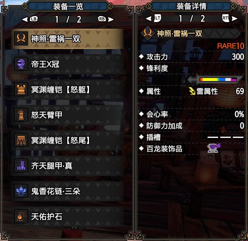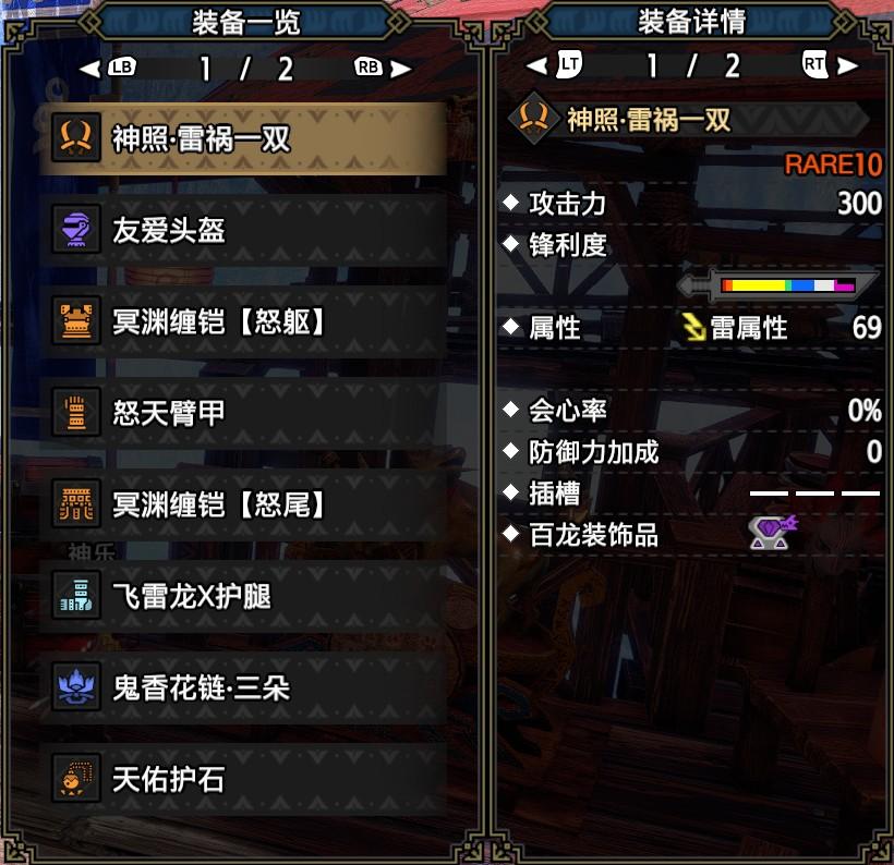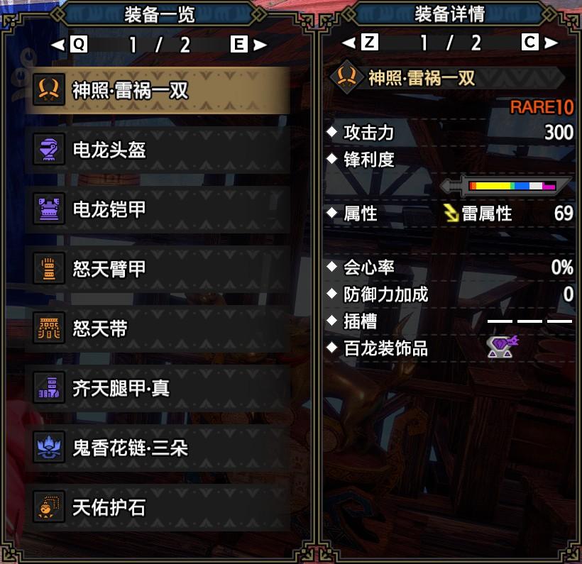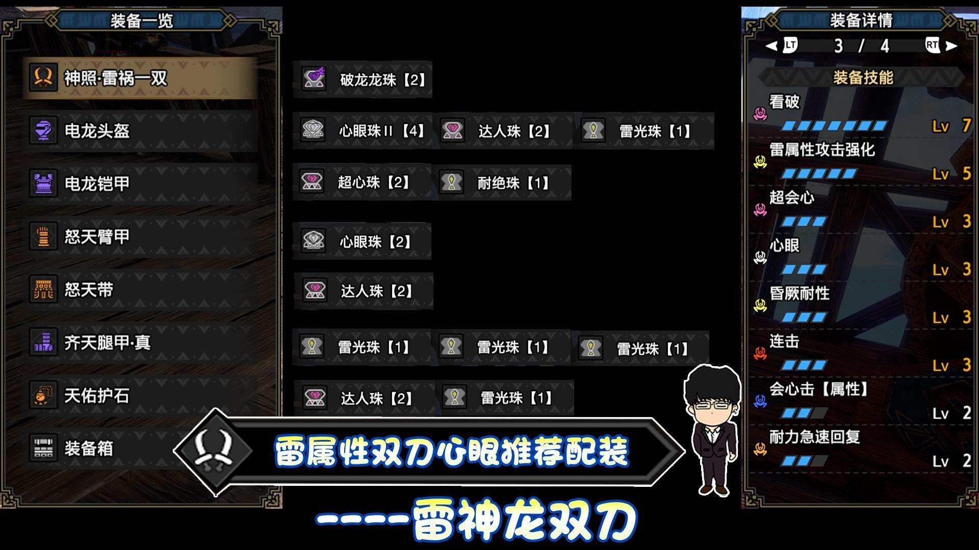 常规,心眼,极限套都选用的雷神龙武器,百龙槽选用破龙龙珠,接下来我们来看看防具搭配。