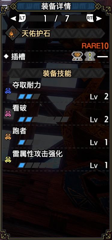 技能:看破7,雷属性5,超会心3,心眼3,昏厥耐性3,连击3,会心击【属性】2,耐力急速回复2,夺取耐力2,减轻胆怯2,力量解放1,利刃1,弹丸节约1,激昂1