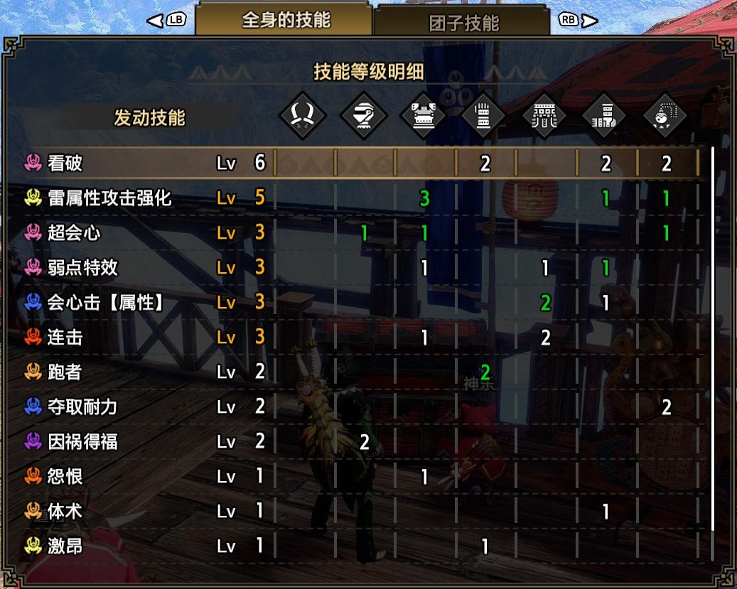 技能:看破6,雷属性5,超会心3,弱点特效3,会心击【属性】3,连击3,跑者2,夺取耐力2,因祸得福2,怨恨1,体术1,激昂1,狂龙症【蚀】1