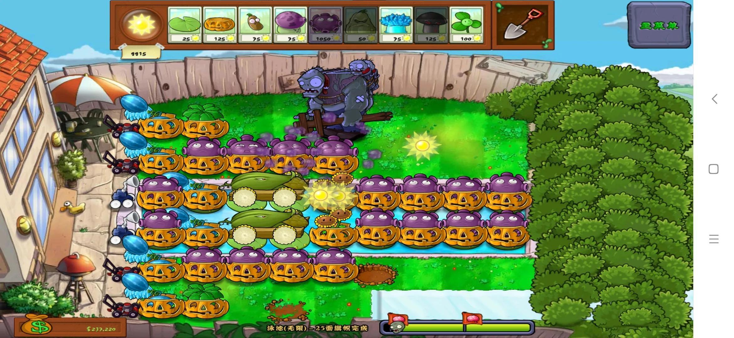 泳池四排大喷菇边二路所有僵尸到不了第四格,边一路由边二楼四排大喷菇解决。边二路前边必须留四格并且不要用钢刺,容易引起小丑僵尸尸炸两个玉米加农炮足够几乎用不上。图上是我扛了四个小时后的截图。拿去不用谢