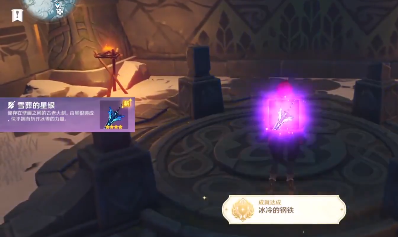 帅气登场的【雪葬的星银】大剑!四个火炬都被激活后就会触发一段动画,雪葬的星银大剑就在动画中出现。别说这出场方式还真的挺帅,看上去就觉得这把大剑非常酷炫非常强的样子。不过这把大剑虽然不错,但是在双手剑武器中只能算是一般。因为强力的双手剑武器太多了,这把武器不如璃骨剑但是也不错了。算是大剑中比较靠前的几把武器,没有更好的武器可以使用一下。最主要的优点是可以自己打造然后精炼。