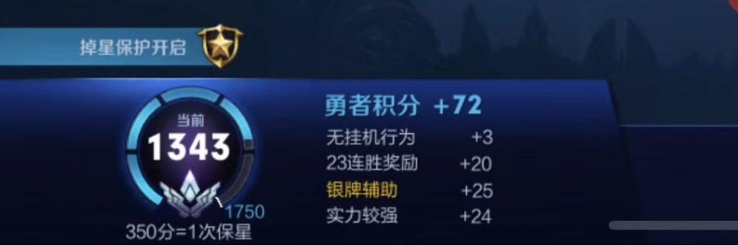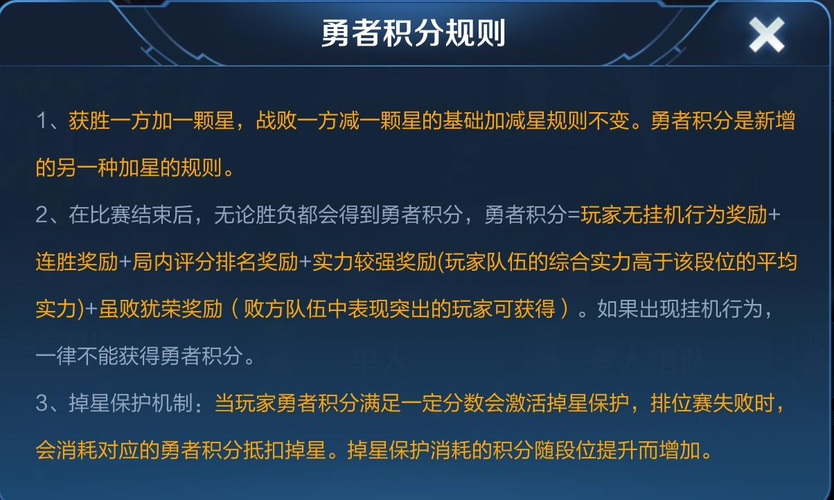 比如星耀局300勇者积分可以抵消一次掉星,相当于一个“复活甲”,要是你没星星的时候还有积分保护,那就不会掉段了。大多数玩家对于勇者积分的认识都比较片面,只是觉得如果在游戏中表现得越好,那么勇者积分就越高,勇者积分的作用就是“掉星保护”。