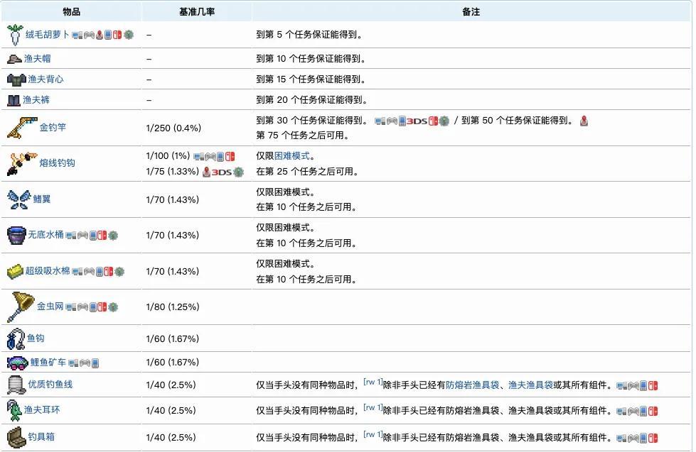 玩家每天可以在渔夫处领取渔夫任务,渔夫任务会在次日 4:30刷新,期间24小时都可以领取任务.完成的任务数量越多,得到的奖励也就越好.(当玩家背包中有渔夫需要的任务鱼时,玩家将不会捕捉到新的任务鱼,但可以通过把任务鱼放在宝箱或者存钱罐此类物品中规避这种情况)