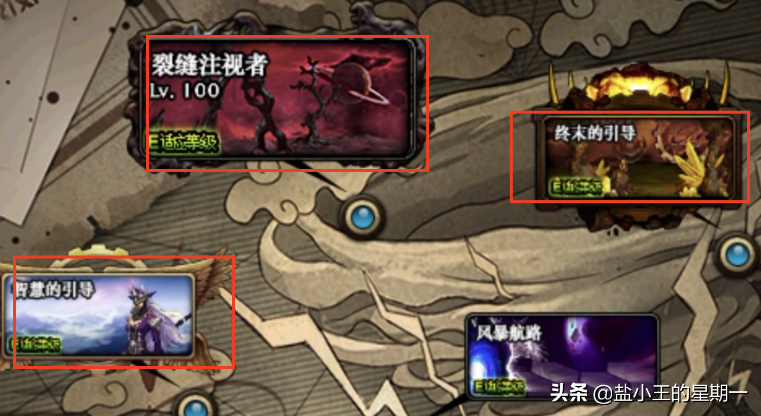 100级深渊史诗最常见的方式是勇士们使用“时间引导石”通关位于“风暴航路”处的以下3个地下城,图中上方两个地下城为近期更新地图,获得史诗的几率更大,同时在通关后会保底获得一个史诗,目前引导石的获取方式非常丰富,勇士们可以多多留意更新的活动与游戏内常驻的兑换方式。