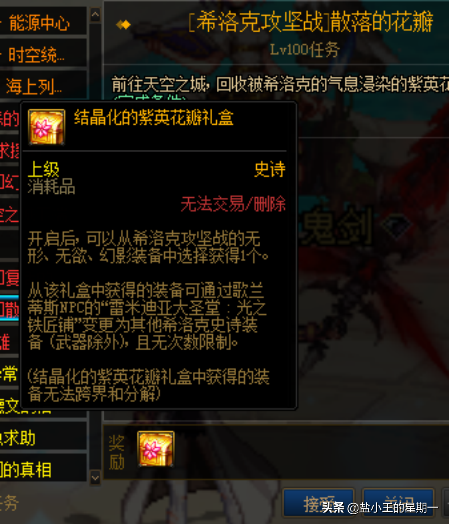 完成外传任务选择一件可以任意变化的希洛克装备,俗称为“百变怪”,笔者在这里建议勇士们一开始材料不要用于开罐子,而是攒够这个任务的数量,因为在这个过程中,说不定那次意外的收获让你获得了一两件团本装备,从而仅差一个部位,那么就可以直接兑换出来。