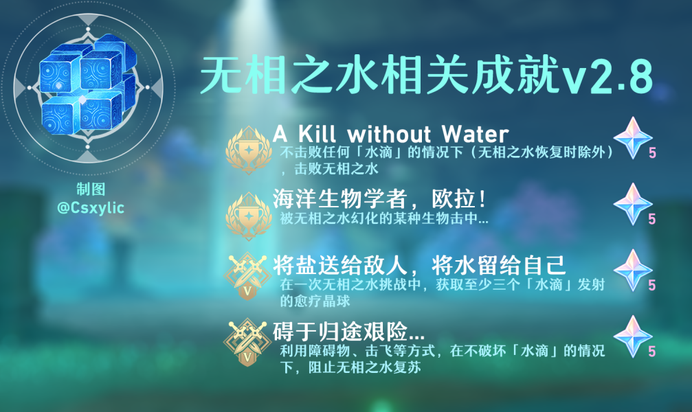 ▋游戏内成就描述:不击败任何「水滴」的情况下(无相之水恢复时除外),击败无相之水