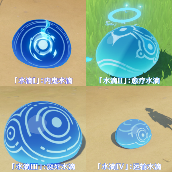 「水滴IV」:又名运输水滴。浅蓝色史莱姆,只出现在无相之水扔出的水泡里面,落地即摧毁,既常见也不常见。