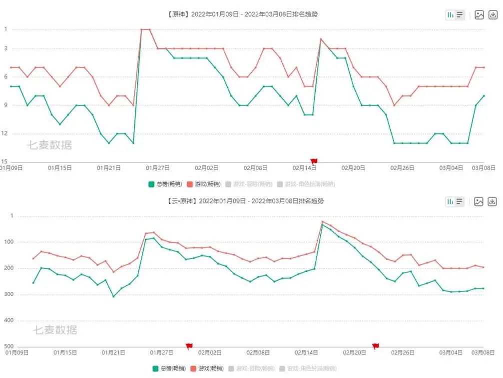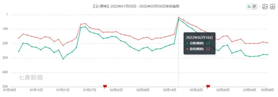 如今,距离iOS版《云·原神》发布已经过去2个月,这款云游戏产品的市场表现也大大超出了GameLook的预期。根据七麦数据显示,iOS版《云·原神》畅销榜上的成绩十分了得,在2月16日版本大更新的节点,更是挤入了游戏畅销榜Top25中。