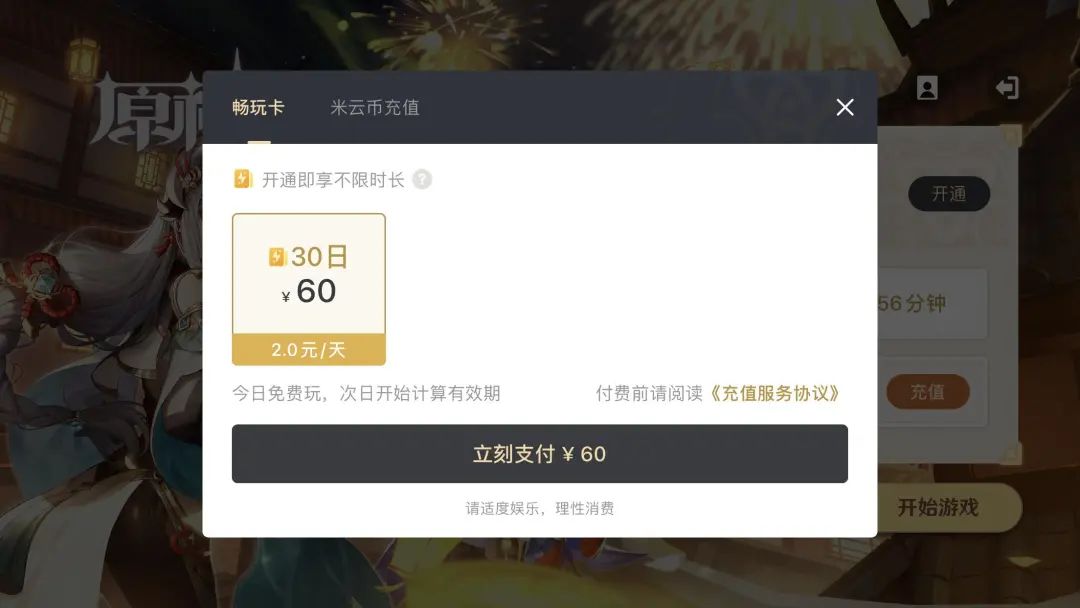 而在商业化层面,《云·原神》选择的模式较为保守,付费点主要集中游戏时长方面,共设有60元的“月卡”与充值米云币购买游戏时长两种服务。