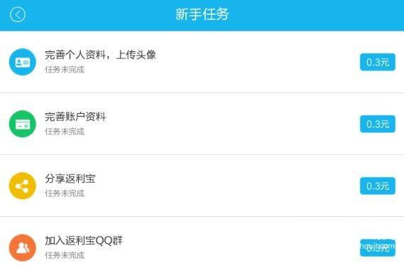 任务说明:按照新手任务列表中来完善个人信息、上传头像以及账户资料,分享返利宝、加入返利宝QQ群等多项任务,即可轻松获得相应价值的平台币。