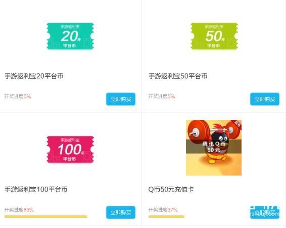 首先我们先进行登录,选择(手游返利宝20/50/100)平台币券,然后选择要参与的人次并付款(平台币),而等到商品的开奖进度100%后,我们可以在【我】个人中心的【夺宝中心】内查看到自己的夺宝记录,运气好的话,这个(手游返利宝20/50/100)平台币券你就能收入囊中,一切看脸。