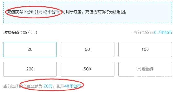 进入到充值页面,我们就可以选择相应的面额进行充值了,这里平台币和现金的比例是1:2哟!再提一下,游戏币充值和平台币是一比一