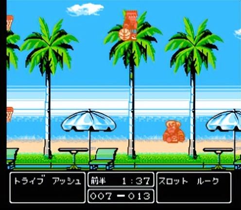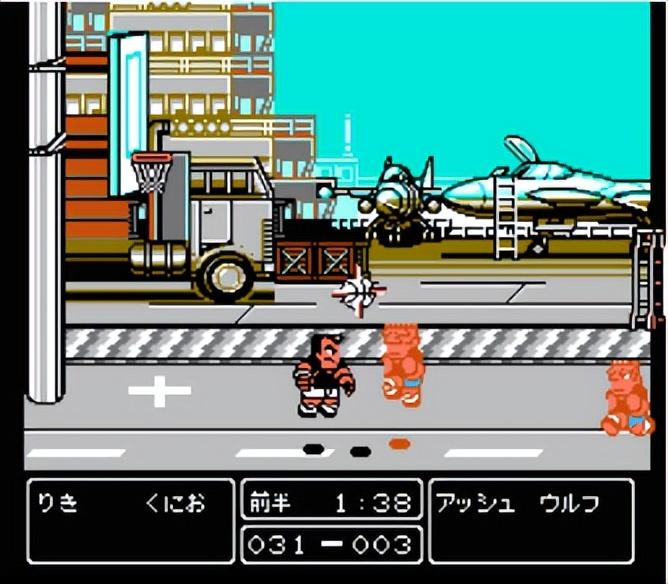 站在最上方的花坛上不能发出必杀投篮。这个场地里的武器物品是功能最强的梯子与垃圾桶,果然是主场作战,物品对热血队如此有利(众所周知,电脑控制的球队是不可能使用物品的,所以,物品越强越对玩家有利)。