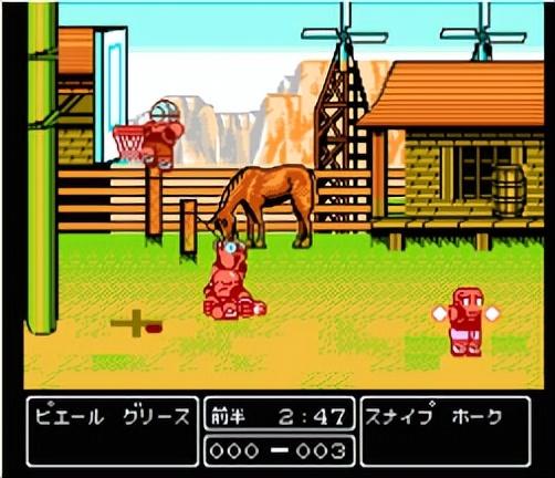 充满了美国西部特色,牧场、马儿、酒巴、火车头……这个赛场最大的特色是马儿,球员跑到马儿臀部,马儿一撂蹶子,人就被踢上天了(方向键按住上,被踢飞到更高位置)。赛场里的物品是石头与箱子。