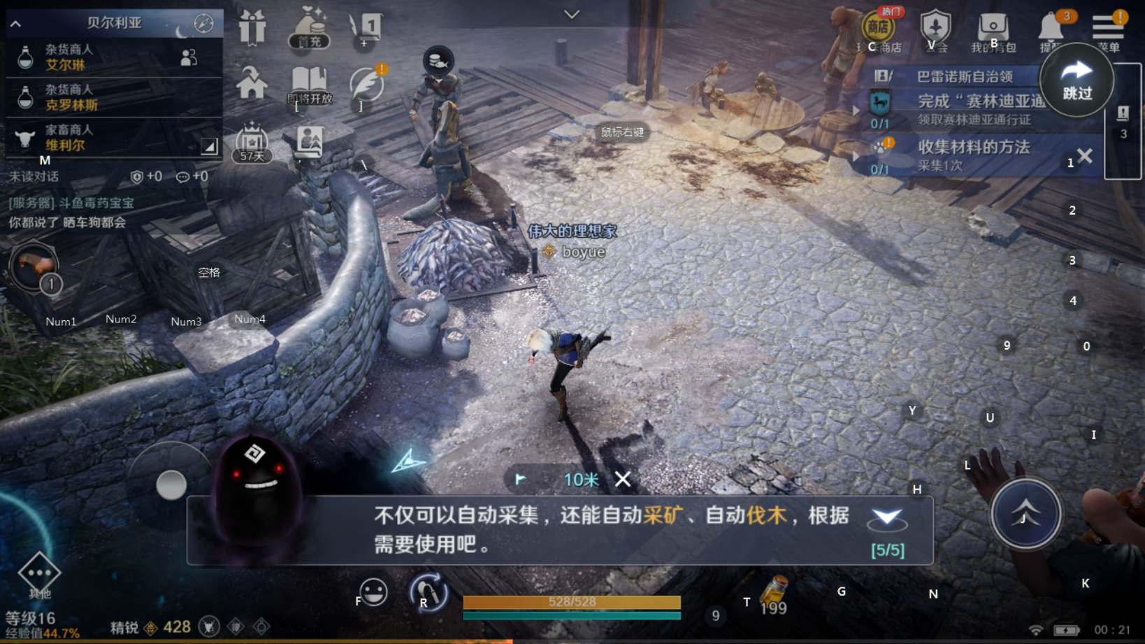 目前玩的还比较初期,没体验到端游中办厂,野外圈地种植,房屋系统的玩法,基本都在跑主线了,boyue感觉这些自由玩法提早开放会更好些,当然,希望不是直接无了,那就忧伤了。