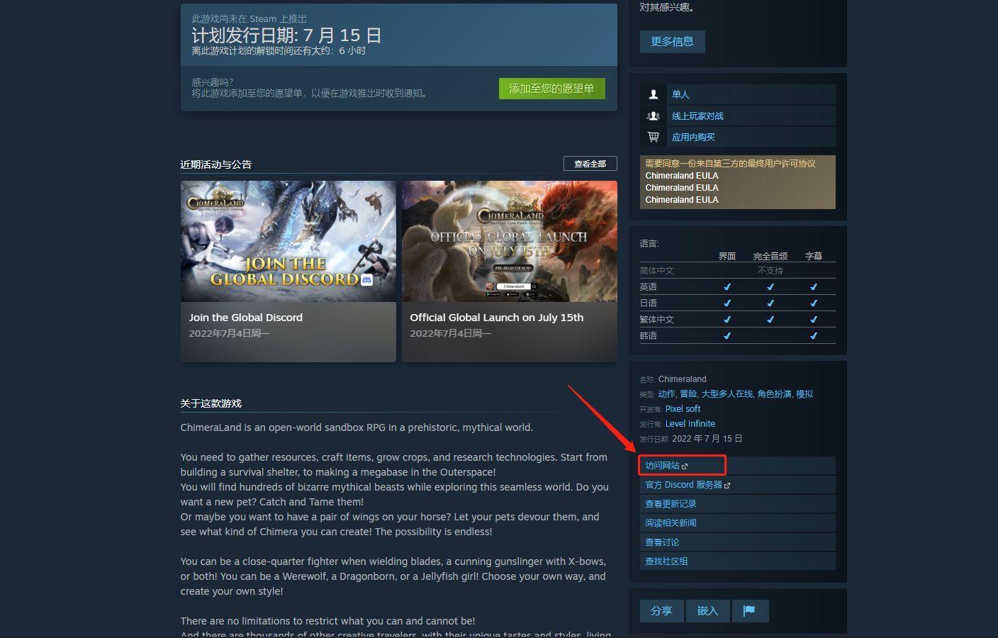2.在Steam上输入“Chimeraland”,搜索后点击进入游戏页面;Steam商店只能搜索英文;