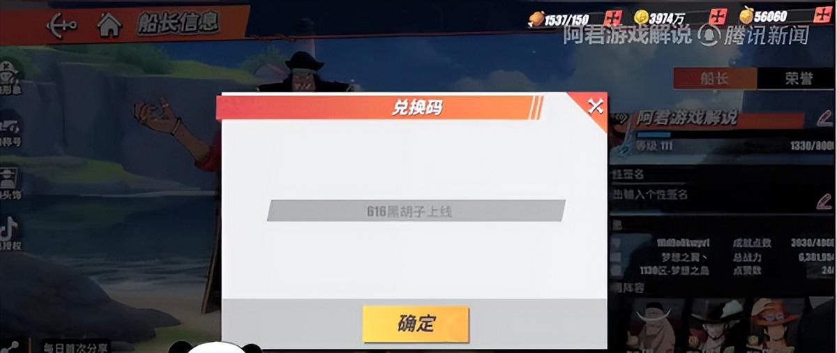 2、在游戏里的兑换码界面输入上面的兑换码后就可以领取到黑胡子的奖励了。