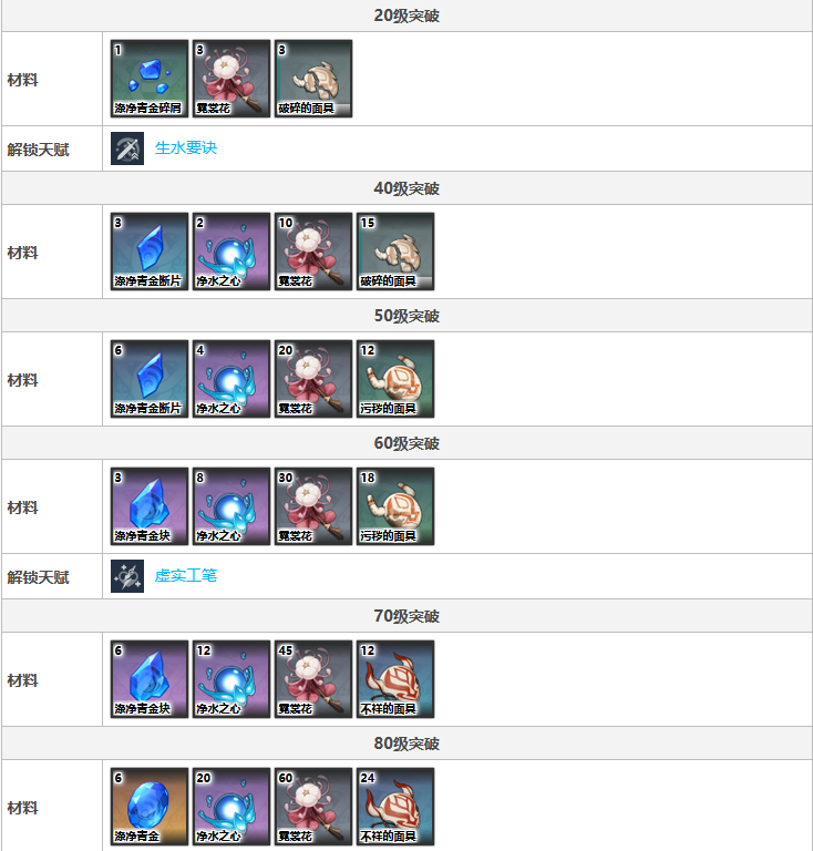行秋是水系角色,所以等级突破材料需要大多数都是纯水精灵掉落的材料,包括涤净青金碎屑、涤净青金断片、涤净青金块、涤净青金以及净水之心,除此之外,还需要采集材料霓裳花和怪物掉落材料破碎的面具、污秽的面具、不详的面具,具体数量如下所示: