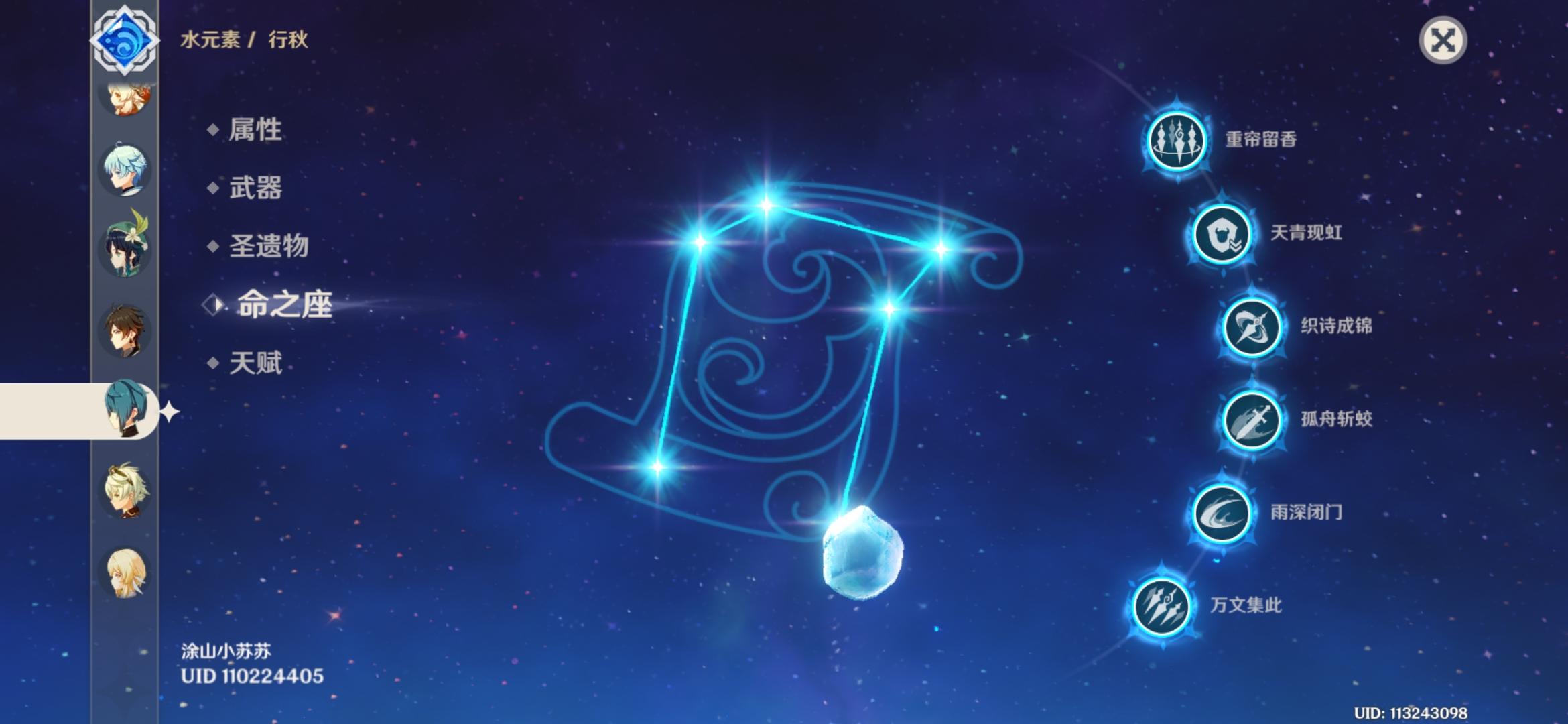 (2命:大招持续时间增加3秒,受大招攻击敌人降低15%水抗。在行秋大招本来伤害就很高的基础上,属于锦上添花的加伤命座。
