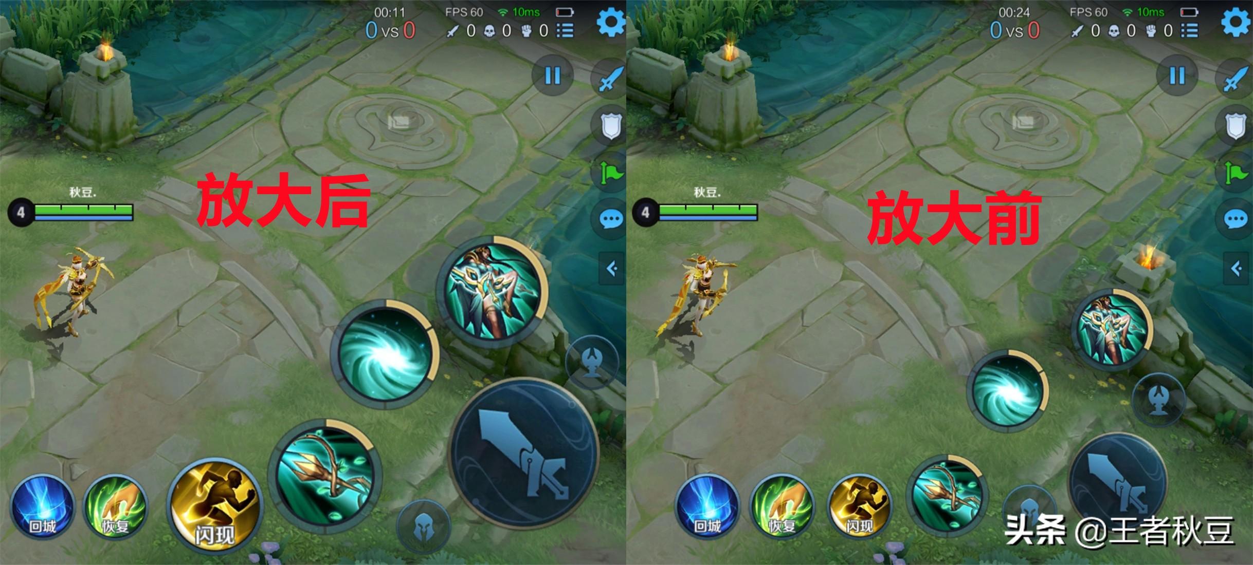 没调整前技能按键和普攻按键都非常小,经常会出现没按到或者按错。这时候,只需要去布局-局内按键自定义就能设置自己想要的按键大小和位置,包括方向盘,召唤师技能,回城等。