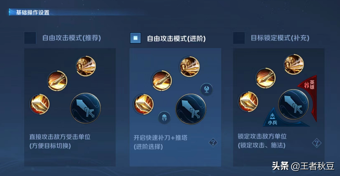 自由攻击模式(进阶):增加补刀和推塔。玩射手一定要开进阶模式,方便推塔。补刀则可以只打兵和野怪,不打人。如猴子,雅典娜等可以用补刀键跳兵。