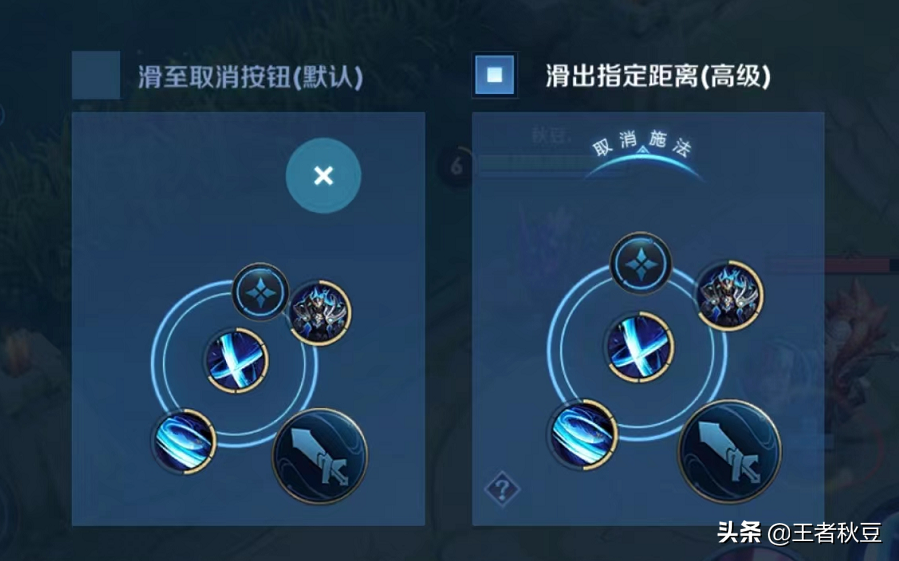 划出指定距离:随意滑动到范围外取消技能。建议选择高级的划出指定距离,取消速度更快。