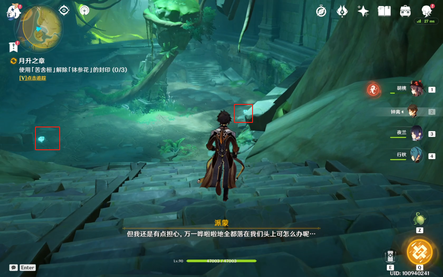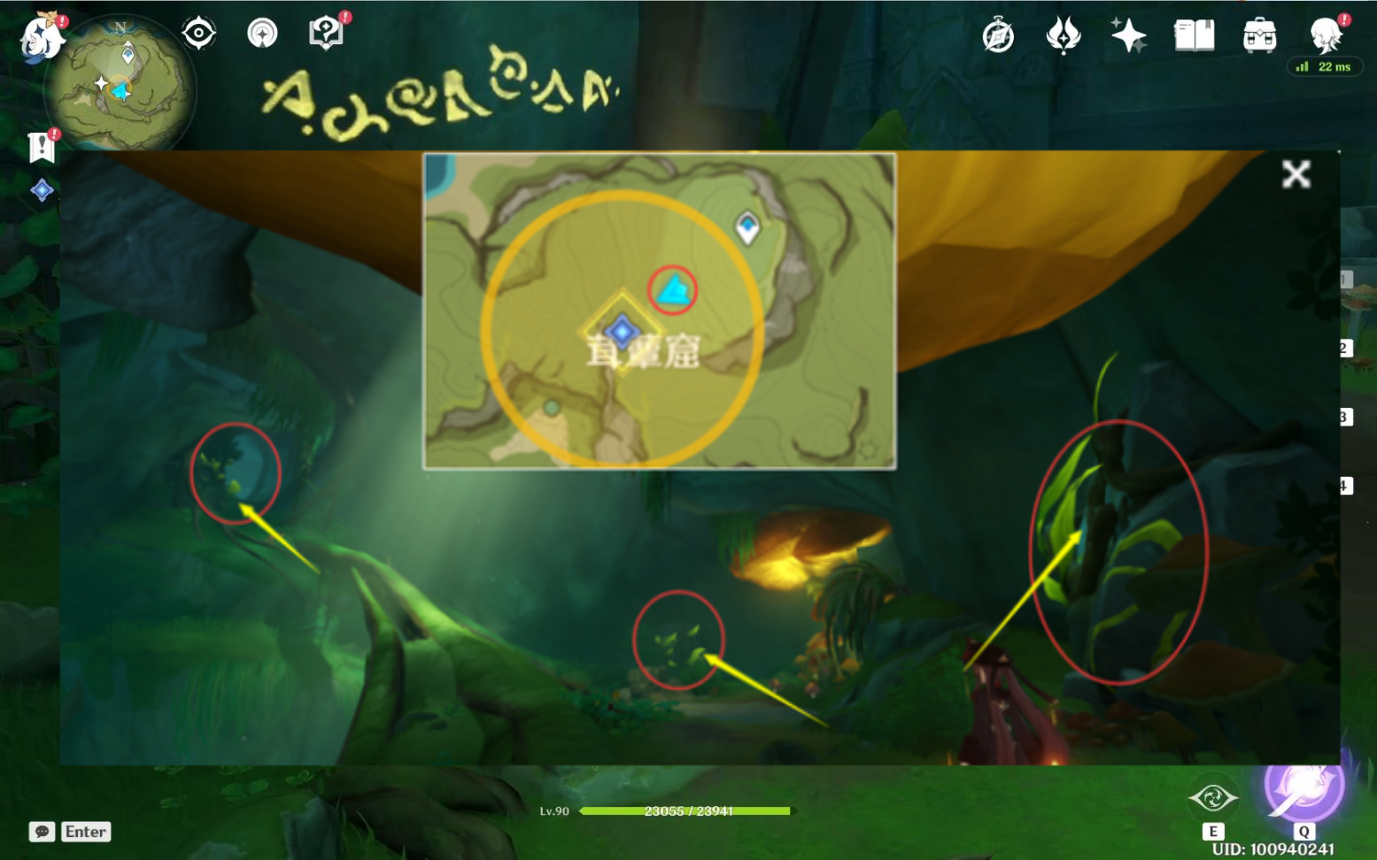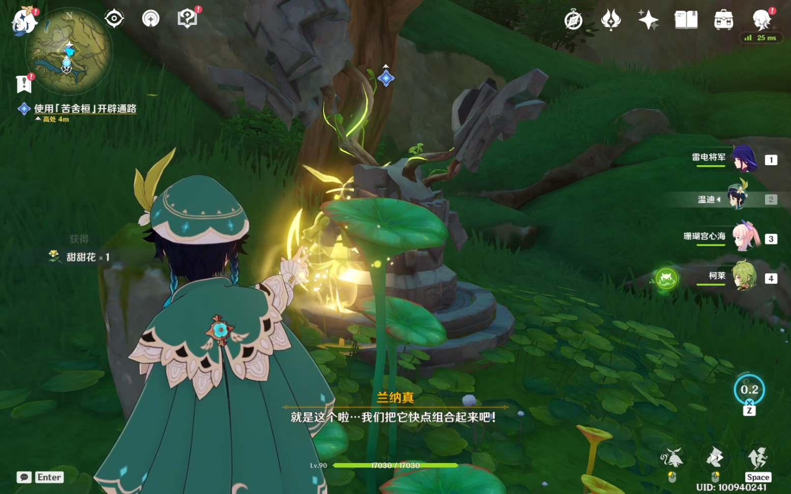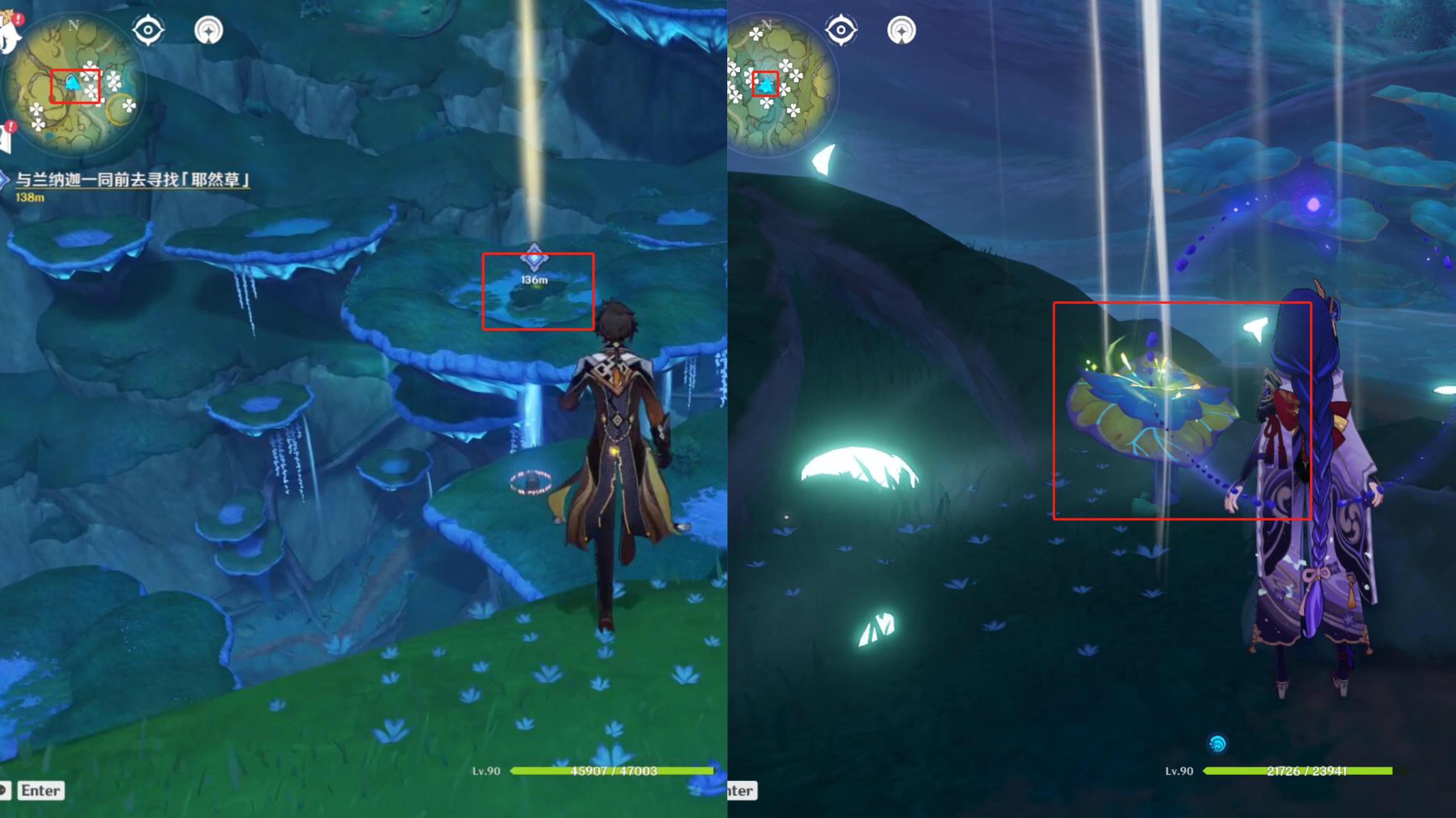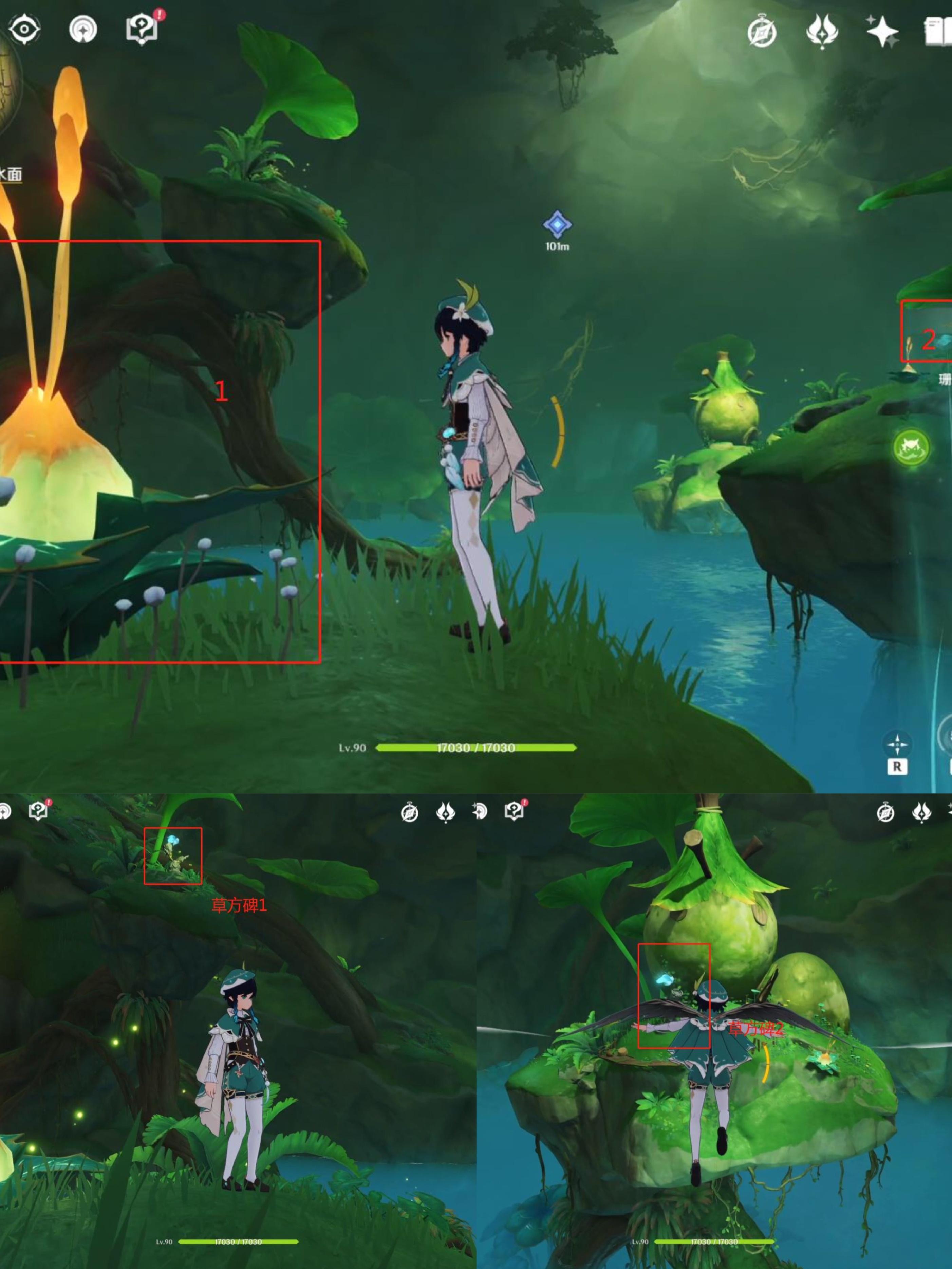 耶然草:与npc对话完后就可以去找耶然草了,可以从左上角的传送点飞过来,也可以用右下角的蘑菇生成风场飞上来(可以顺便拿个草神瞳)。