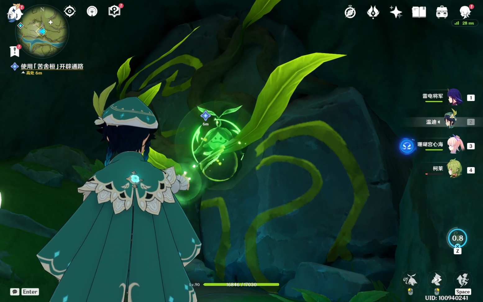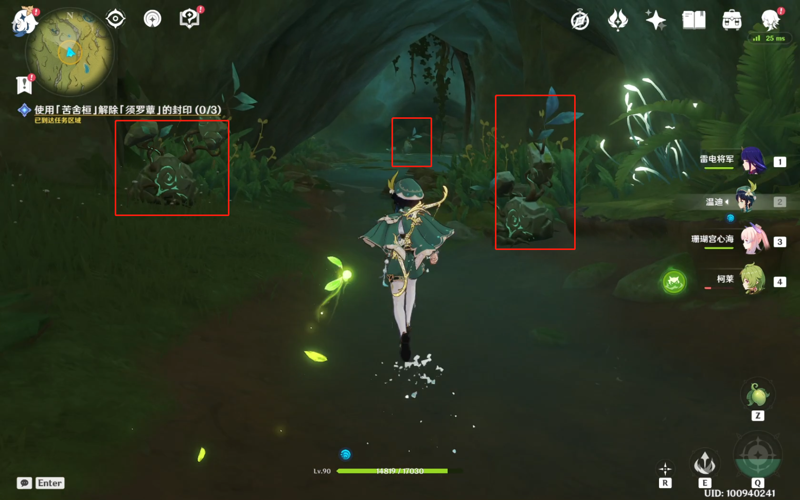 探索洞穴:须罗蕈就在大树下方的树洞里,触碰后它就跑了,然后用草元素攻击旁边的众叶觉蕊飞往洞口,这里切忌直接从外面传送,触发不了任务的。