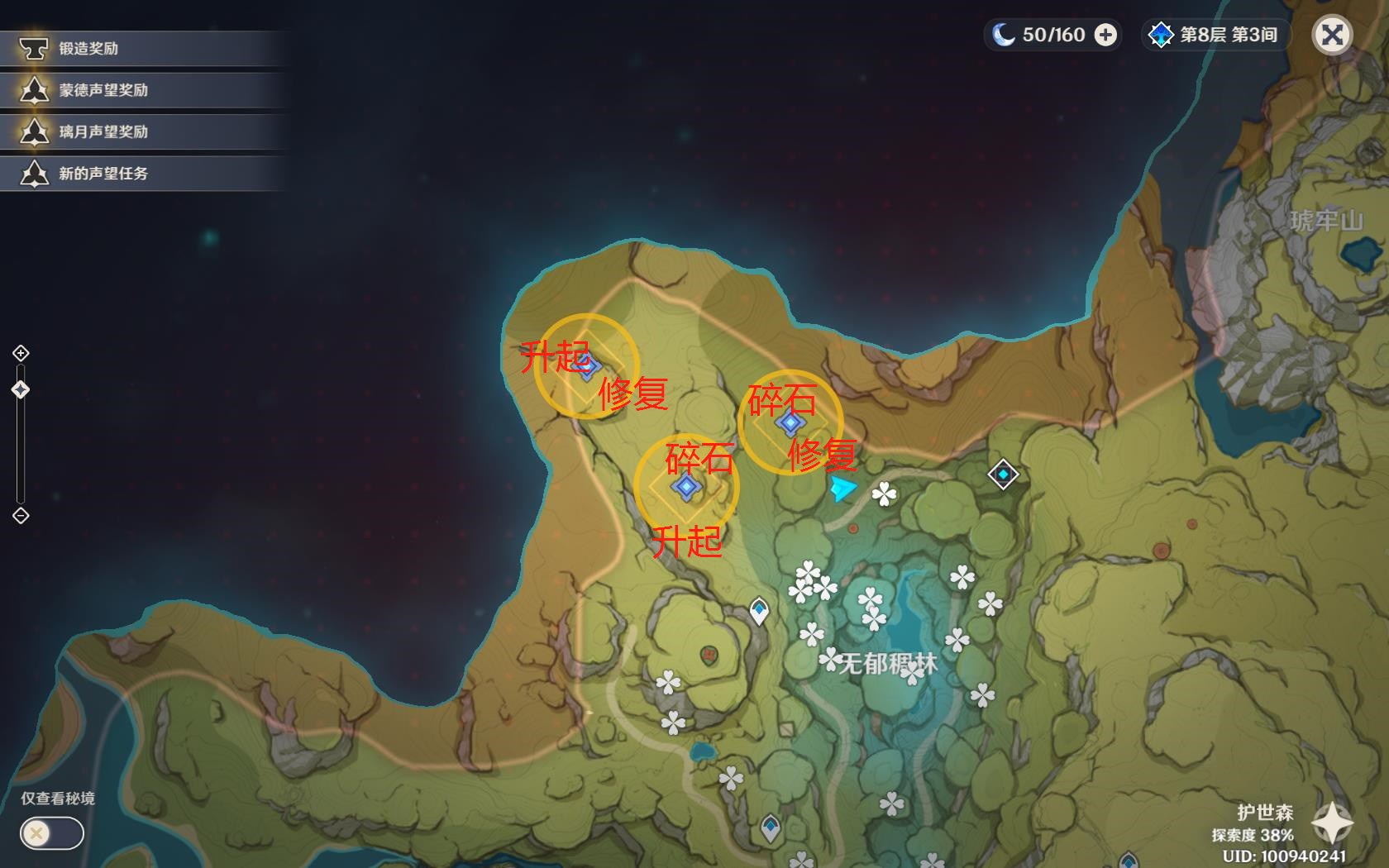 红色为升起台子,黄色为修复,绿色为破坏石头。记不住也没关系,切换下再试就行,这边可以升起的台子在旁边树桩的水里,需要找下。