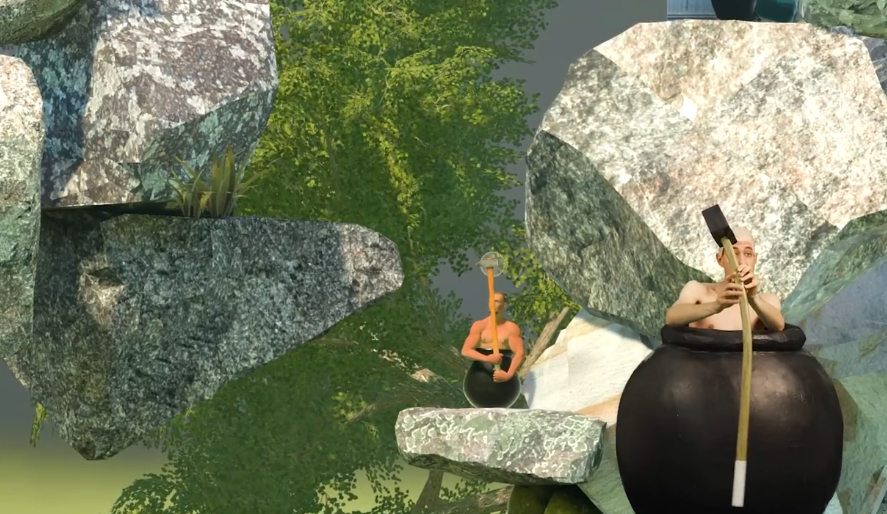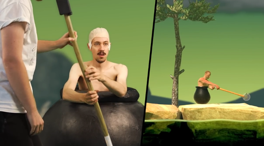 曾经火爆一时的恶搞游戏《掘地求升》还有多少玩家记得?近日一位老外玩家主播搞了新玩法,自己钻进大壶里,COS成游戏主角的样子,使用带有动作控制功能的“大锤”挑战游戏中的攀岩。